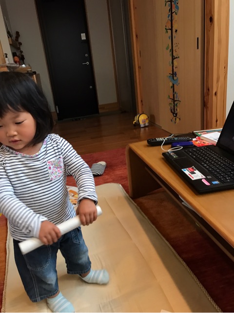 振りに使う棒にみたてて、サランラップの芯をあげました(笑)