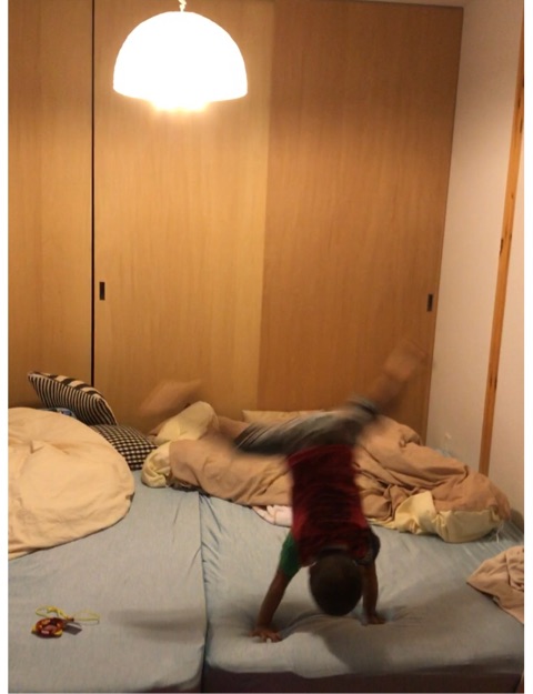 ▼ねる前の大騒ぎでベッドで側転する坊主。