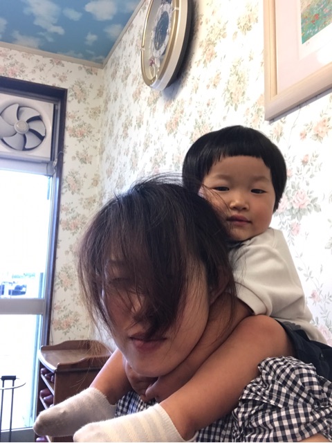 ▼疲れ切った鍛錬のであとも容赦なく娘は私によじ登ります。ジャングルジムじゃないよー。