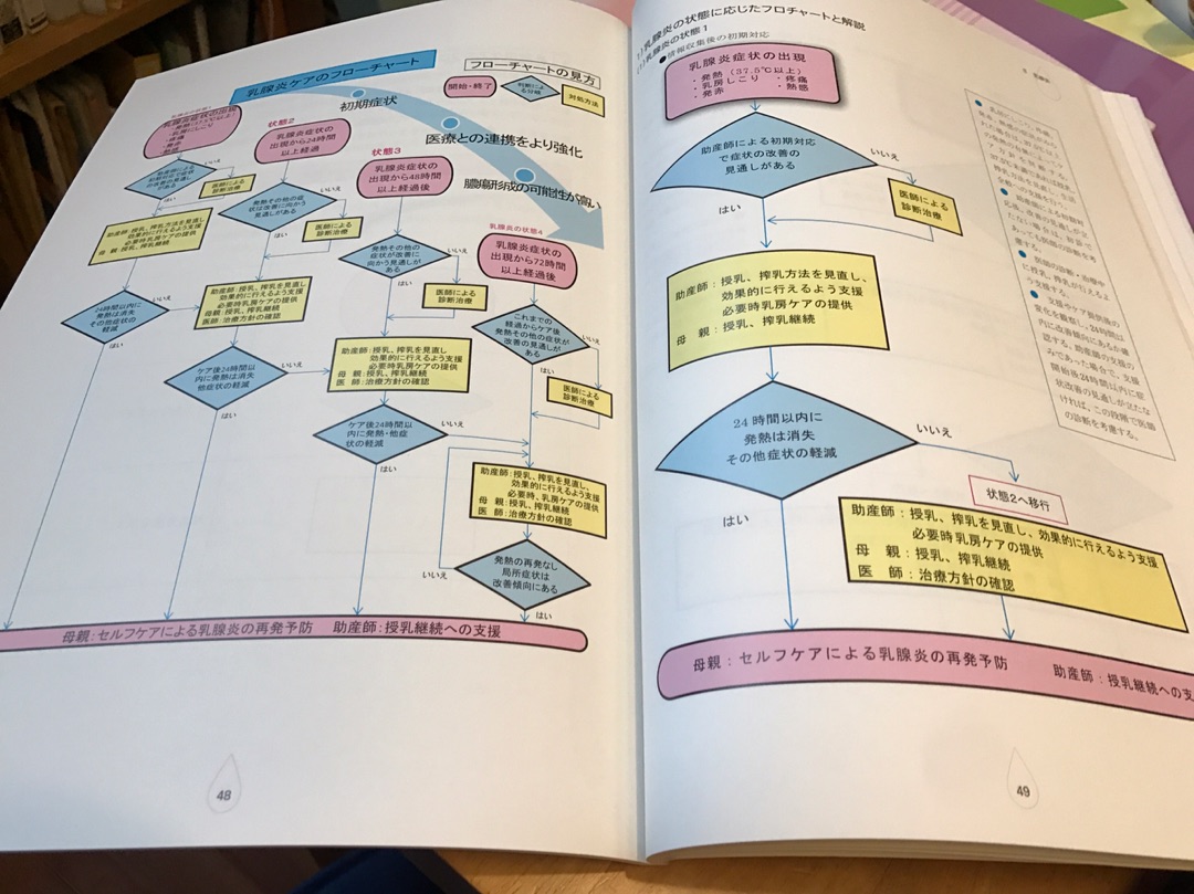 (乳腺炎のフローチャートにしたがって支援をおこなっていきます。この対処が遅れたりすると、膿がたまってしまうリスクも増え外科的な処置は心身共に苦痛なものだからです。。)
