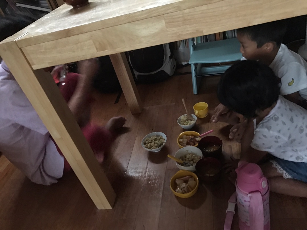 そして、なぜかテーブルのしたで、ご飯を食べる人たち。
